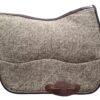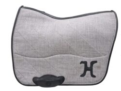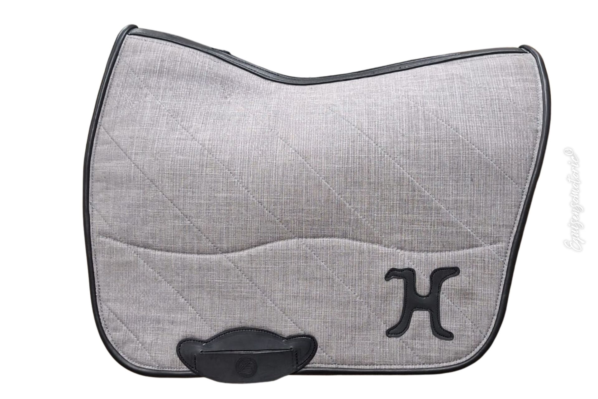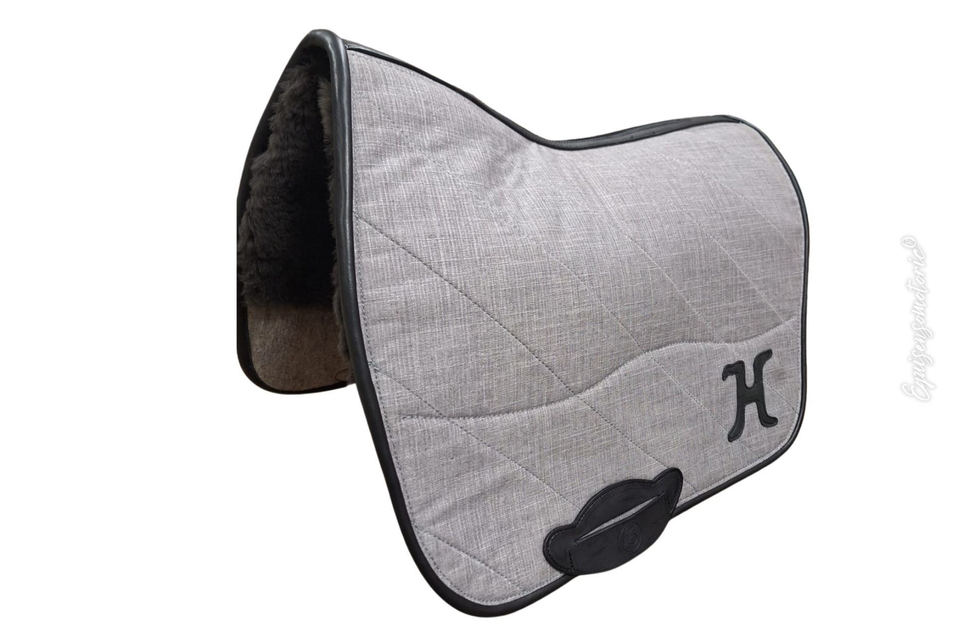 Grauer, edler Webstoff mit schwarzem Ledereinfass. Auf Kundenwunsch mit Hannoveraner Brandzeichen als Lederemblem.
