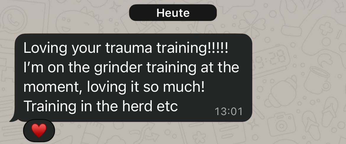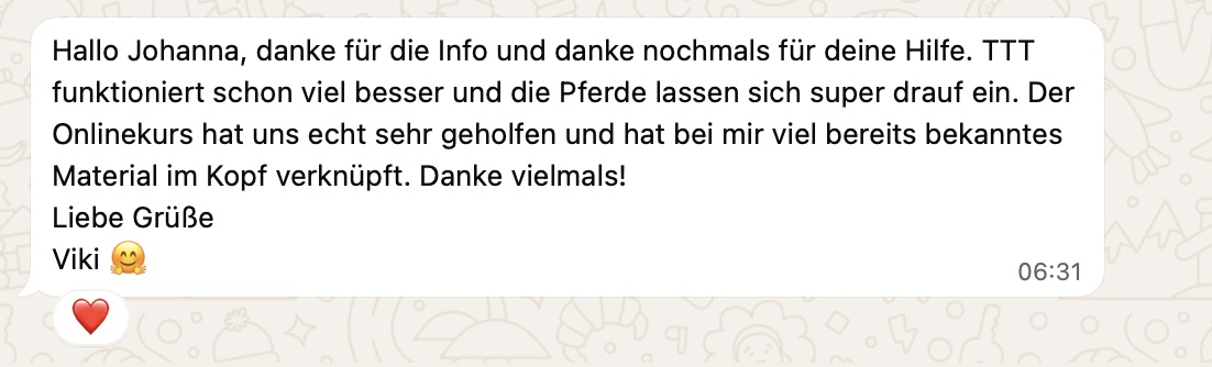 Als sinnvolles Extravideo zeige ich dir noch ein die praktische Anwendung eines besonderen Stimmsignals. Dieses setze ich ein, um das Vertrauen meiner Pferde auch in unangenehmen Situationen (z.b. tierärztliche Untersuchungen) stets zu erhalten.