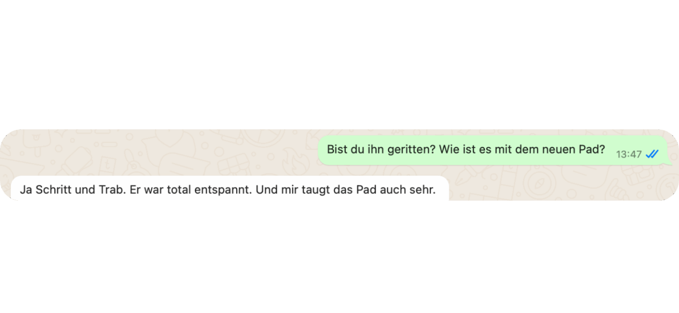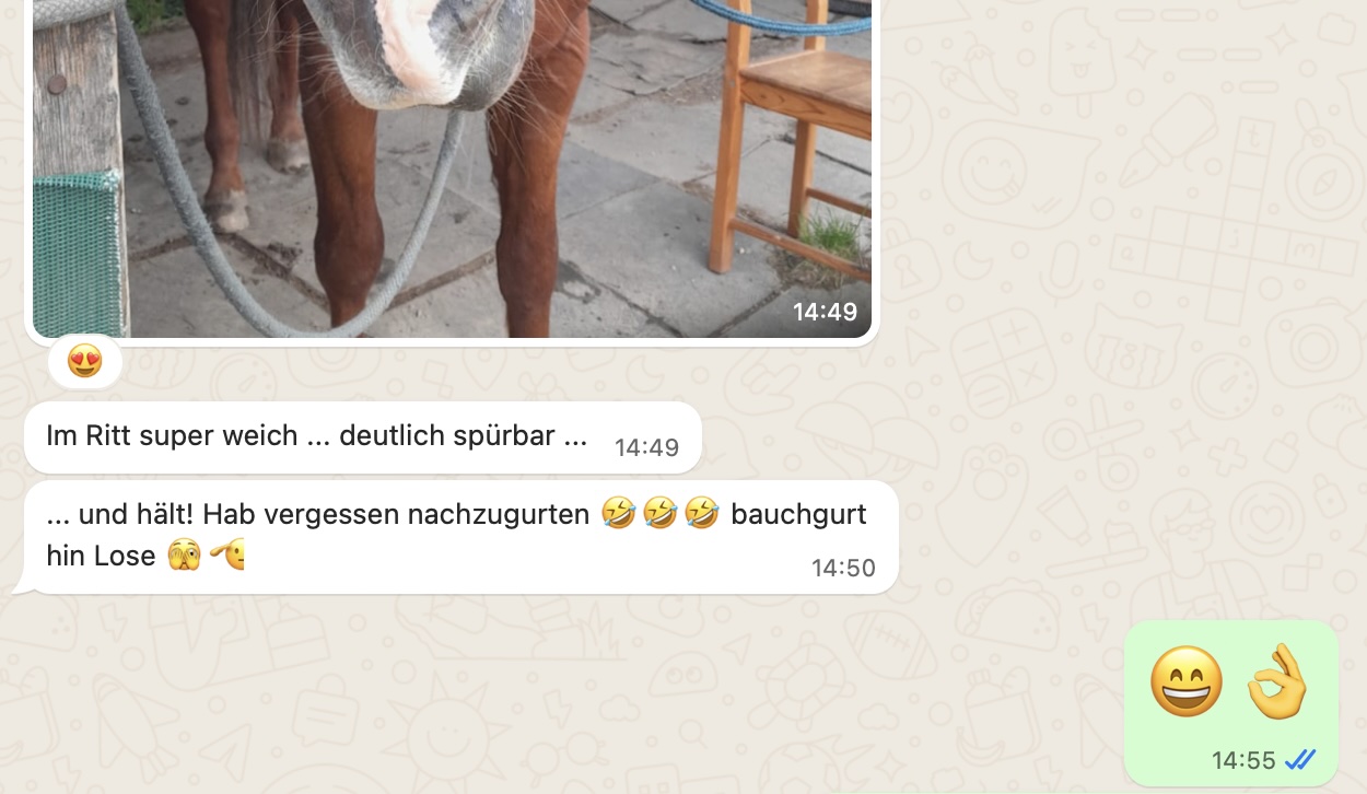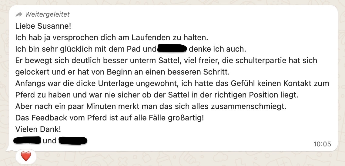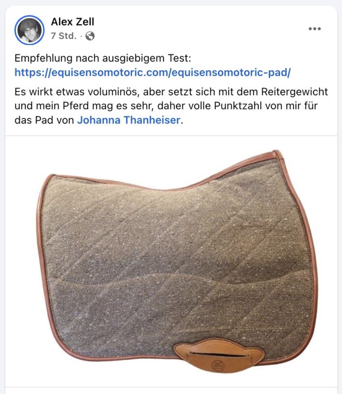 Wie so viele Entwicklungen beginnt auch die des Equisensomotoric® Pad mit der Liebe zu Pferden. Nach einer gefühlt ewigen Suche nach einem Sattelsystem, das keine Druckspitzen auf ihren Pferden hinterlässt, legte die Pferdetrainerin Johanna Thanheiser schließlich selbst Hand an. Sie fing an unterschiedlichste Satteltypen und Materialien in Bezug auf ihre Druckverteilung genau zu testen. 200 Druckspitzenmessungen und einige selbstgenähte Prototypen später, hatte sie ihr Ziel erreicht: die perfekte Druckverteilung! Zwei Dinge waren hierfür nötig: ein zum Pferd passender Sattelbaum und eine individuell angepasste Unterlage mit Schichtaufbau – das Equisensomotoric® Pad war geboren! Ursprünglich nur für ihre eigenen Pferde entwickelt, wollten schließlich immer mehr ReiterInnen ein Equisensomotoric® Pad. Seit 2023 fertigt die Sattlerin Susanne Heil das Equisensomotoric® Pad mit ihrem bewährten Deckenschnitt in liebevoller Handarbeit und höchster Qualität.